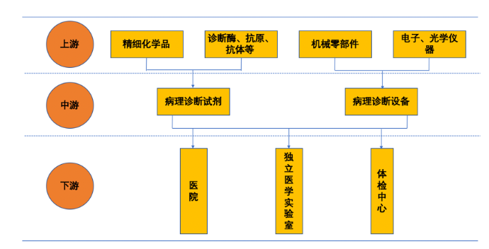 病理行業(yè)產(chǎn)業(yè)鏈包括上游原料市場(chǎng)、中游試劑設(shè)備市場(chǎng)和下游需求診斷市場(chǎng)。原料包括生物與化學(xué)原材料以及各種機(jī)械零配件,分子病理還會(huì)涉及到引物、探針等;中游包括病理診斷試劑和病理診斷儀器;下游需求主要來(lái)自于醫(yī)院、第三方獨(dú)立醫(yī)學(xué)實(shí)驗(yàn)室、體檢中心、政府等。